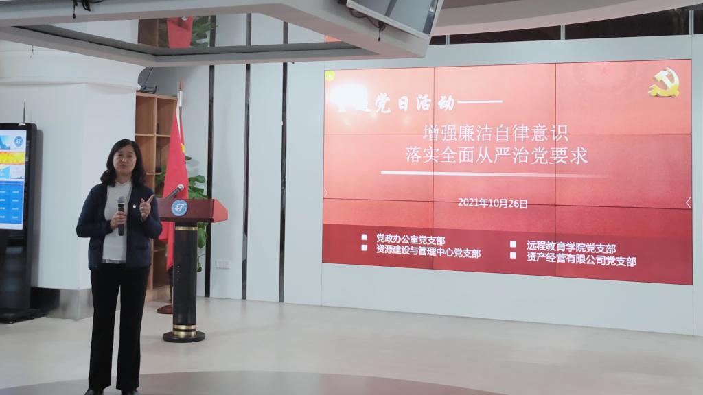 为深入贯彻十九届中央纪委五次全会精神,引导广大党员牢固树立纪律意识和规矩意识,切实落实全面从严治党要求,10月26日下午,资源建设与管理中心党支部与党政办党支部、远程教育学院党支部、资产经营公司党支部,组织支部全体党员、入党积极分子开展以“增强廉洁自律意识,落实全面从严治党要求”为主题的党日活动。校纪委副书记、纪检监察室主任薛峰莅临现场指导。