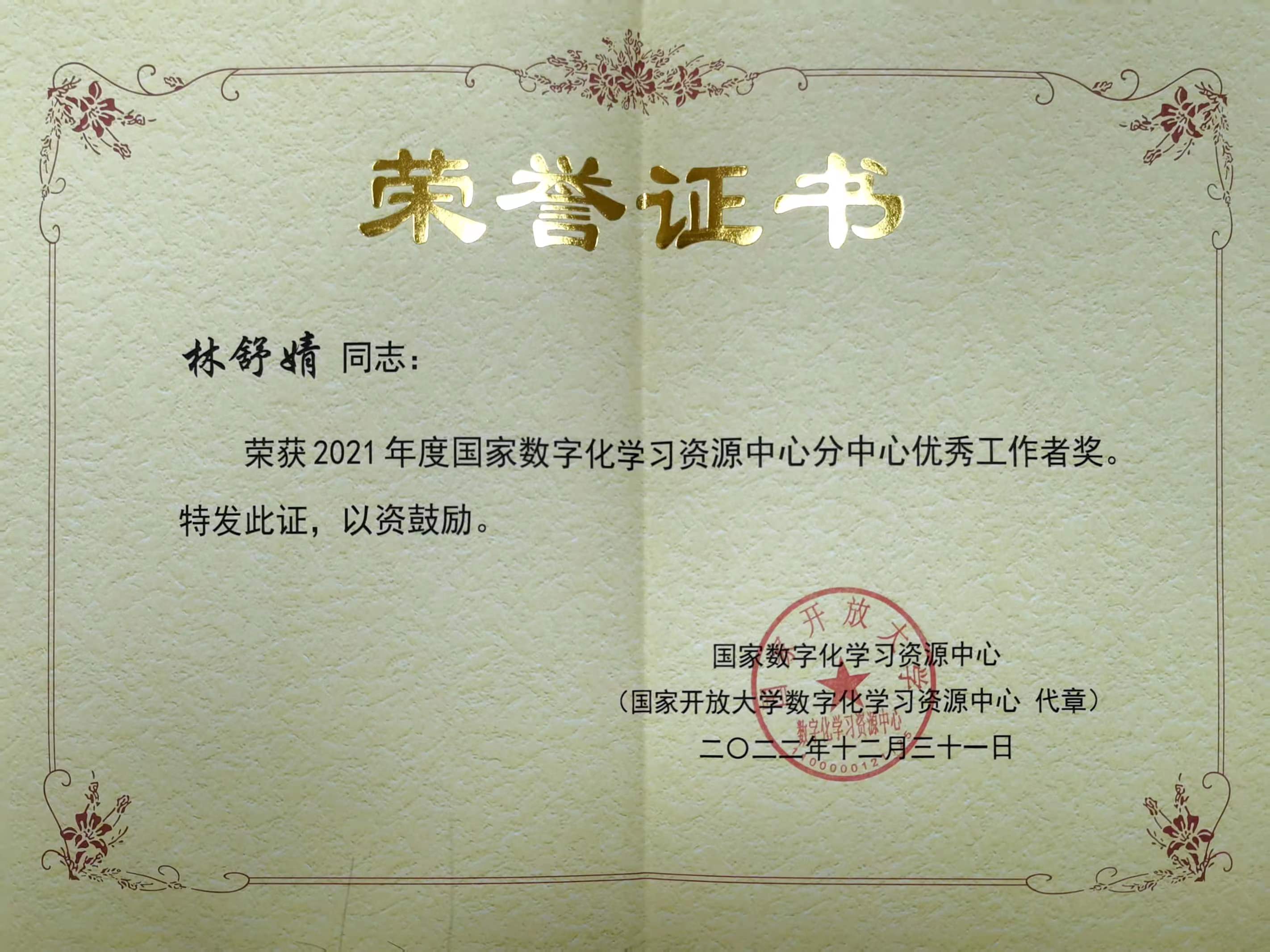 近日,国家数字化学习资源中心公布了2021年度国家数字化学习资源中心分中心优秀工作者称号评选结果,我校资源建设与管理中心林舒婧同志荣获国家数字化学习资源中心分中心“优秀工作者”称号。