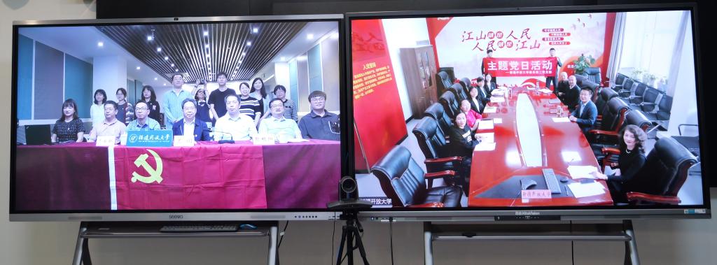 双方支部党员现场缴纳了4月份党费,福建开放大学卓晶晶、新疆开放大学刘晓亚还过了政治生日。