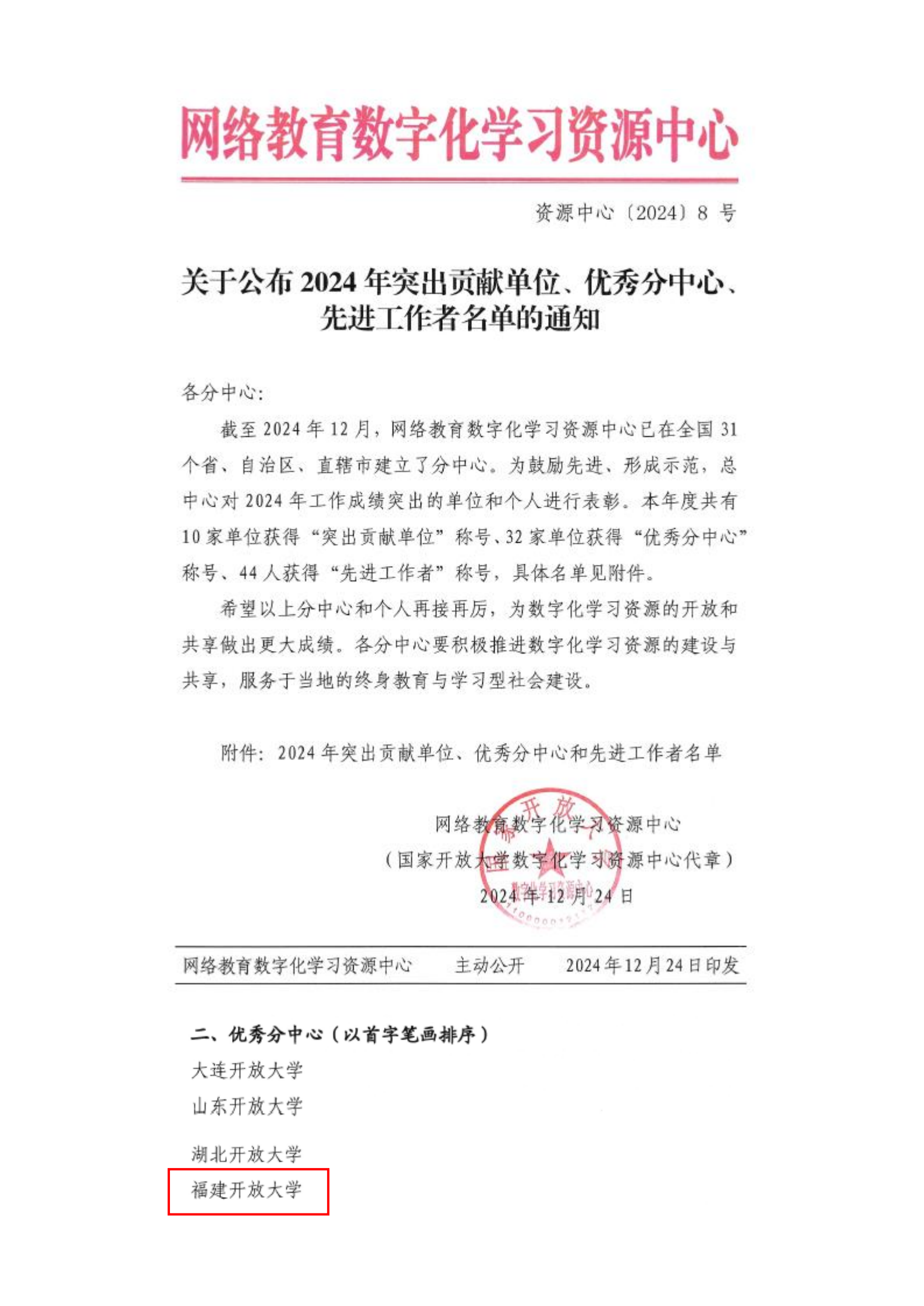 会议还表彰了2024年度优秀单位,公布了优秀数字化学习资源获奖名单。我校喜获2024年度“优秀分中心”、“优秀组织单位“和“先进工作者”称号。我校马克思主义学院与资源建设与管理中心联合制作的教学视频《追求远大理想 坚定崇高信念》入选优秀数字化学习资源名单。