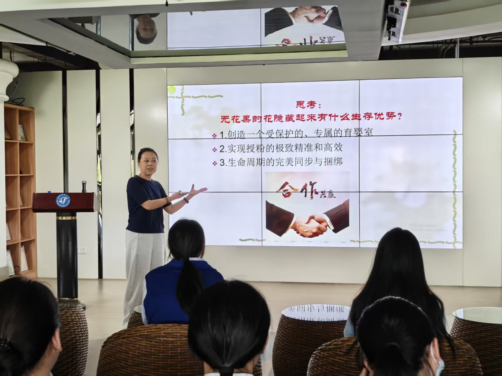本次讲座通过生动的案例与精美的图文,深入浅出地揭示了植物作为“自然界的终极工程师”所展现的多样生存策略。讲座伊始,郑敏老师以“最古老、最伟大却最谦逊的奇迹”引入主题,指出植物是“生命的战略大师”。她借助多个典型案例——如无花果隐藏花朵的繁衍智慧、银杏亿年存续的抗逆机制,以及猪笼草在贫瘠环境中捕氮为食、菟丝子以化学方式追踪寄主等行为,系统揭示了植物在繁衍、竞争与环境适应中所运用的惊人策略。郑老师还引导师生思考鬼针草等常见植物背后的生存逻辑,激发了大家对自然奥秘的探索热情。