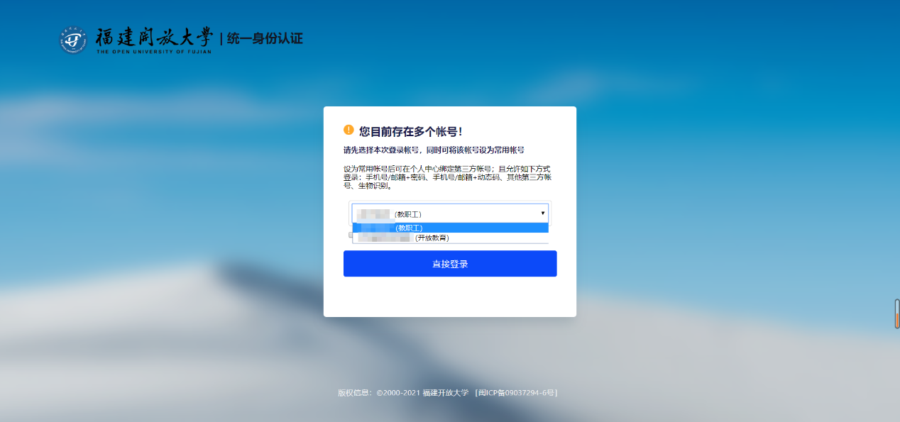 当您既是学校的教职工,又是学校的学生,那么系统会为您分配两个账号,首次登录时,系统会让您设置一个常用账号,您可以根据账号的使用频率情况设置其中一个为常用账号,设置完成后,后续即可直接登录您设置的常用账号。